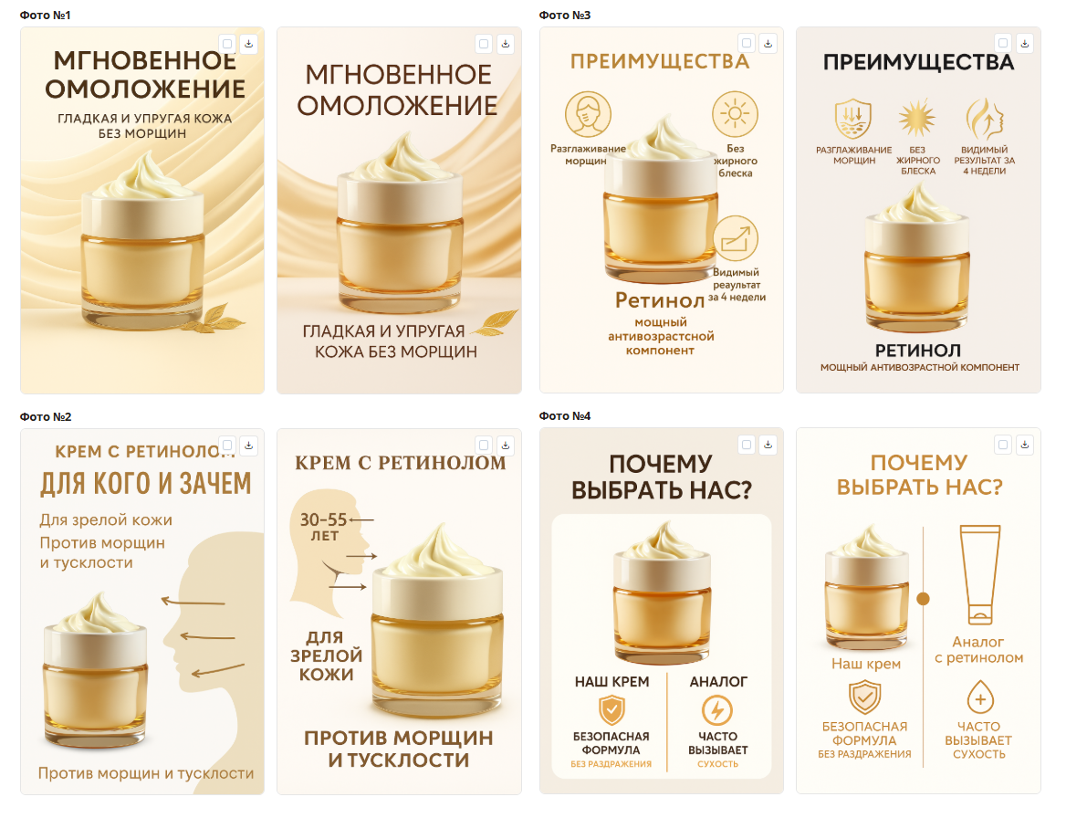 Пример: продавец косметики использует фото продукта на белом фоне для основного изображения, добавляет фон на фото, создает инфографику с составом, преимуществами продукта, а потом делает с помощью ИИ короткую видеообложку с демонстрацией нанесения крема. Такой комплексный подход помогает повысить позиции товара в поиске Wildberries и OZON за счет привлекательного визуала, релевантного контента.