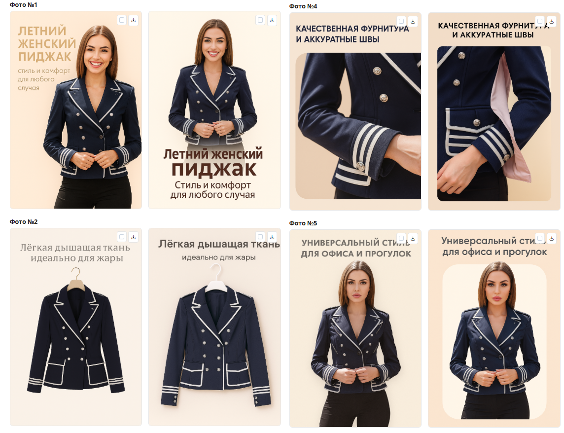 Пример: продавец одежды может показать изделие на модели, отдельно рукав или воротник крупным планом, а также инфографику с размерной сеткой.