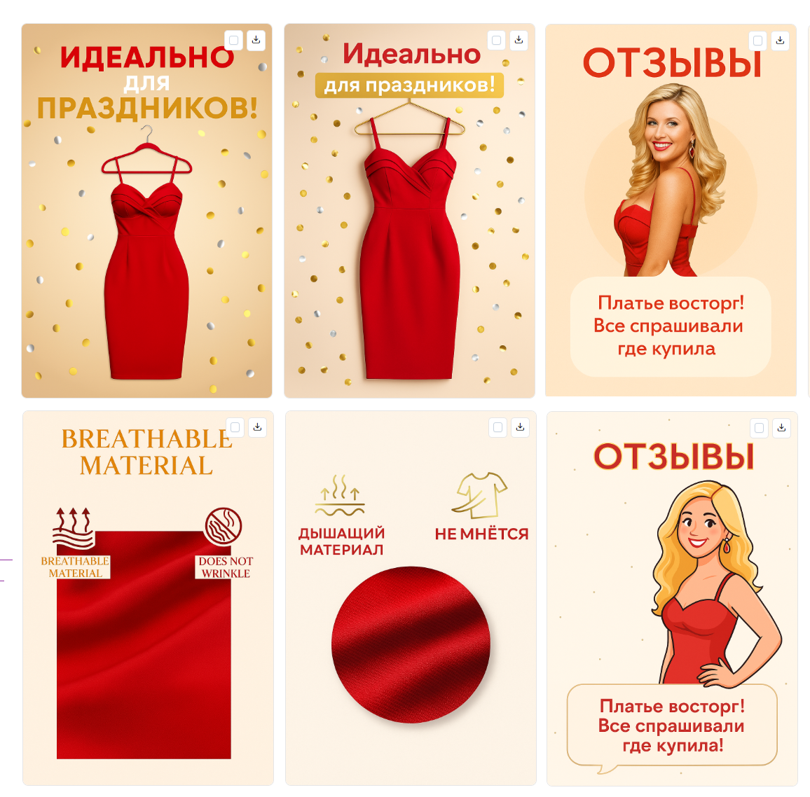 Останется лишь выбрать изображения и загрузить в карточку на WB или OZON. При необходимости можно прописать промпты вручную.