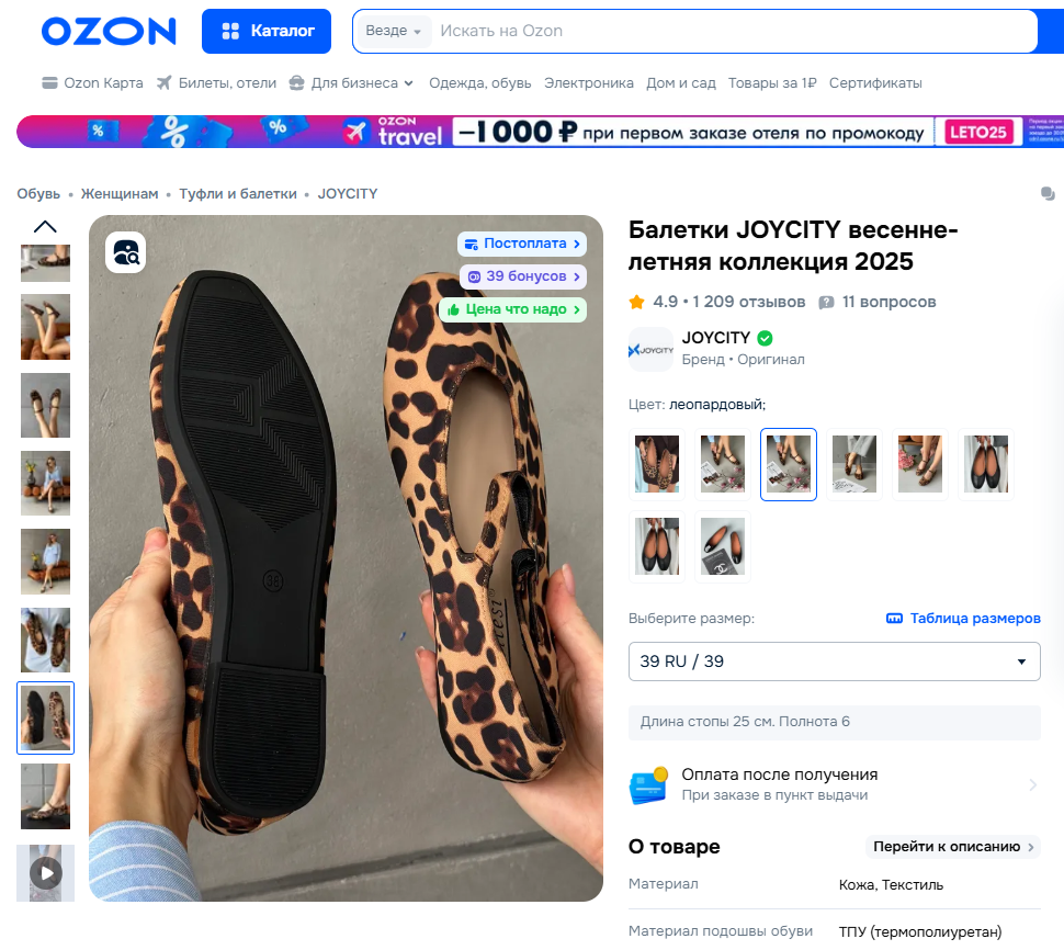 Пример, как можно оформить карточку с балетками (на скрине — не основное фото, а одно из тех, что демонстрирует потребительские свойства).