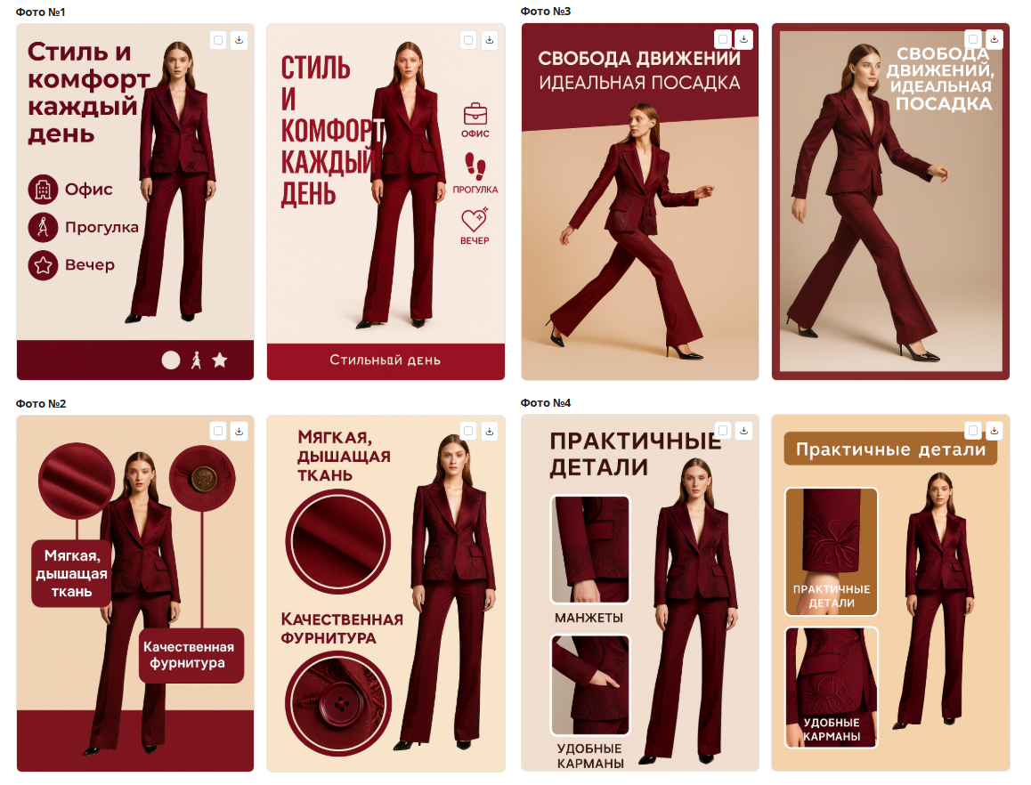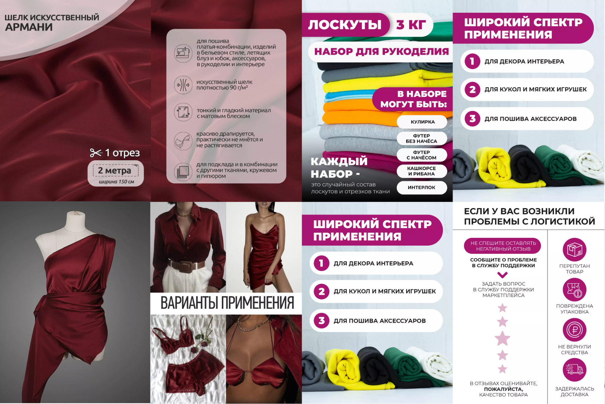 - Дополнительные изображения: Раскрывают детали, показывают комплектацию, использование товара, размерные сетки, варианты применения.