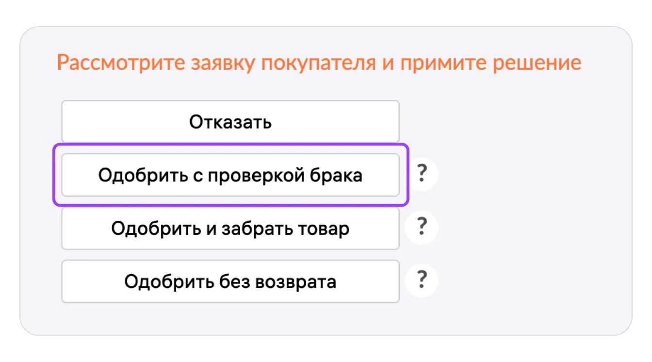 - Для невозвратных товаров используйте только «Одобрить с проверкой брака».