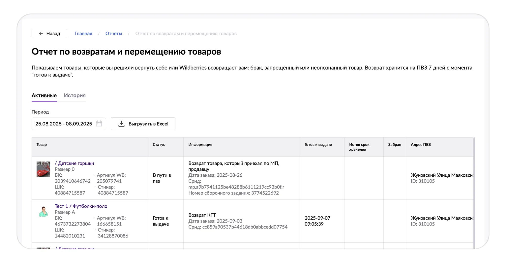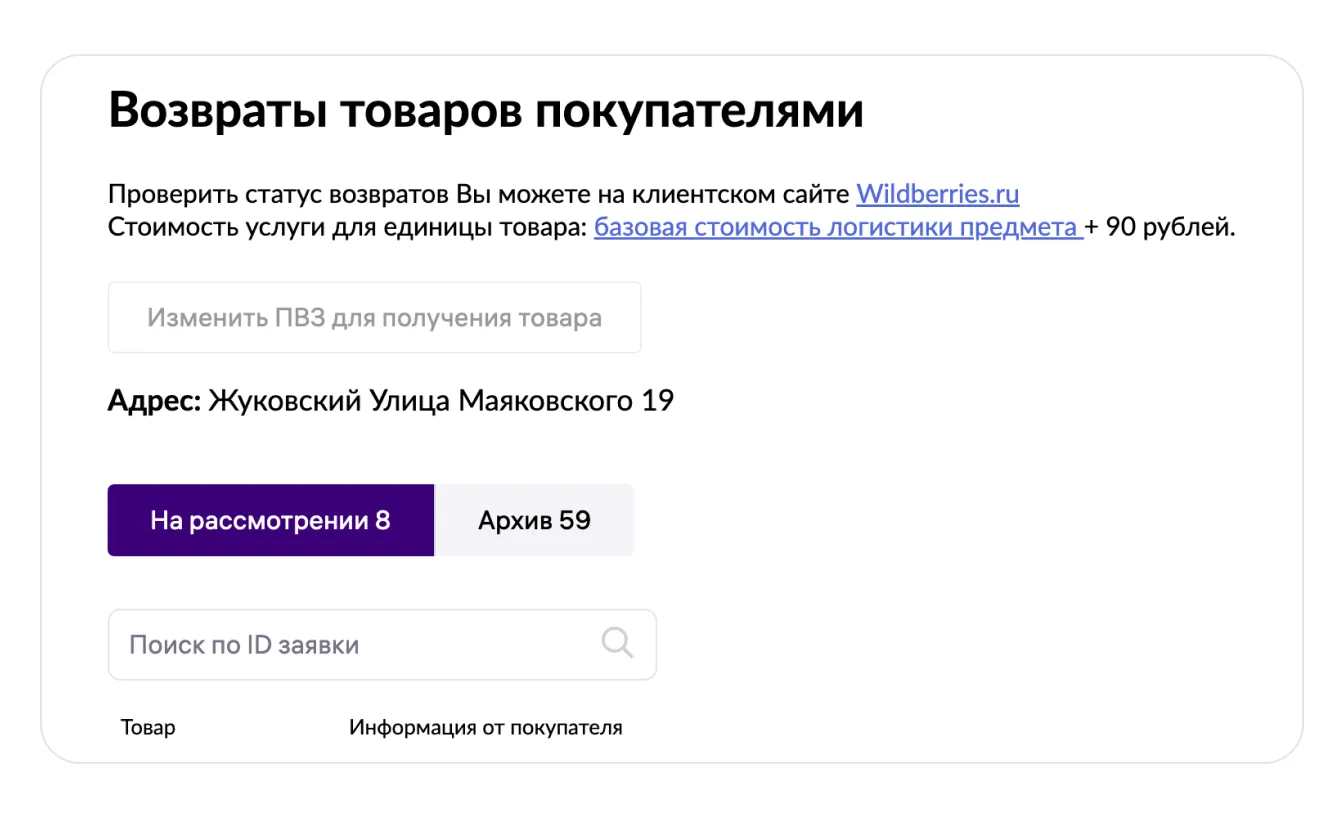 В таблице отображается ключевая информация: товар с его данными, текущий статус обработки, адрес ПВЗ для отправки. Здесь также представлена дополнительная информация, необходимая для принятия решения.