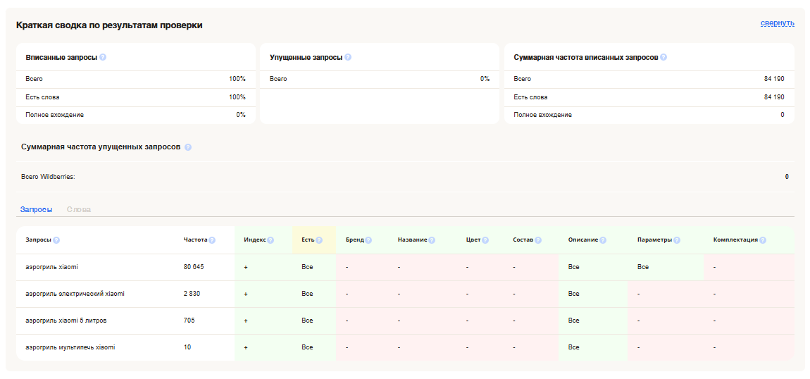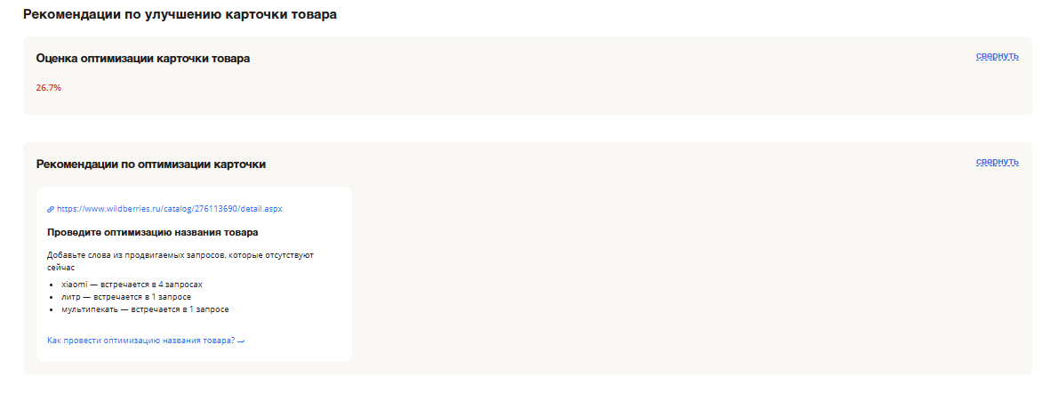 В нашем примере карточка оптимизирована только на 26,7%. Есть над чем поработать. Сервис предлагает добавить слова из продвигаемых запросов.