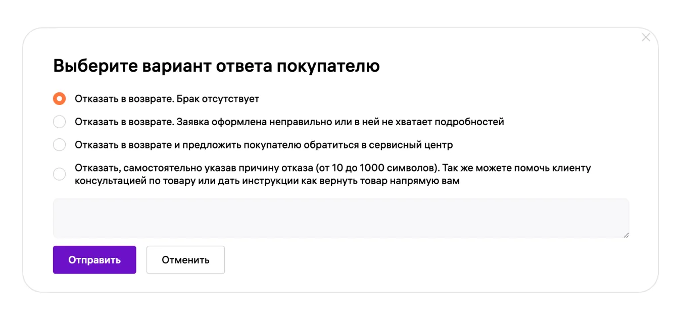 - Когда использовать: Только если требования покупателя необоснованны, а товар не имеет брака и, возможно, относится к категории невозвратных (если это не брак).