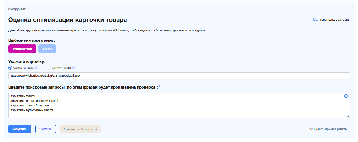 Просто выберите маркетплейс, укажите ссылку (артикул), список запросов. Запустите инструмент. Дождитесь окончания проверки.