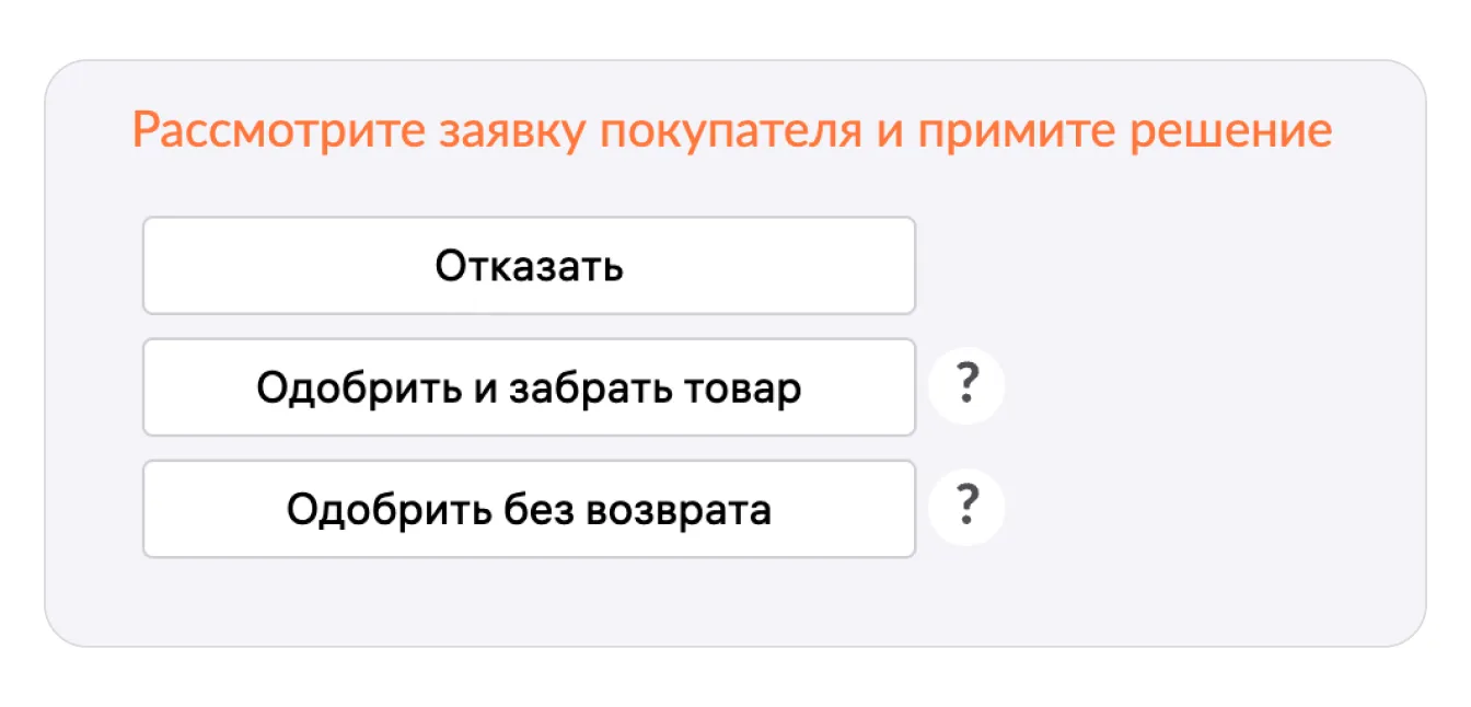 В зависимости от товарной категории, у селлера есть ровно три варианта действий: отказать, одобрить «без» или «с» возвратом.