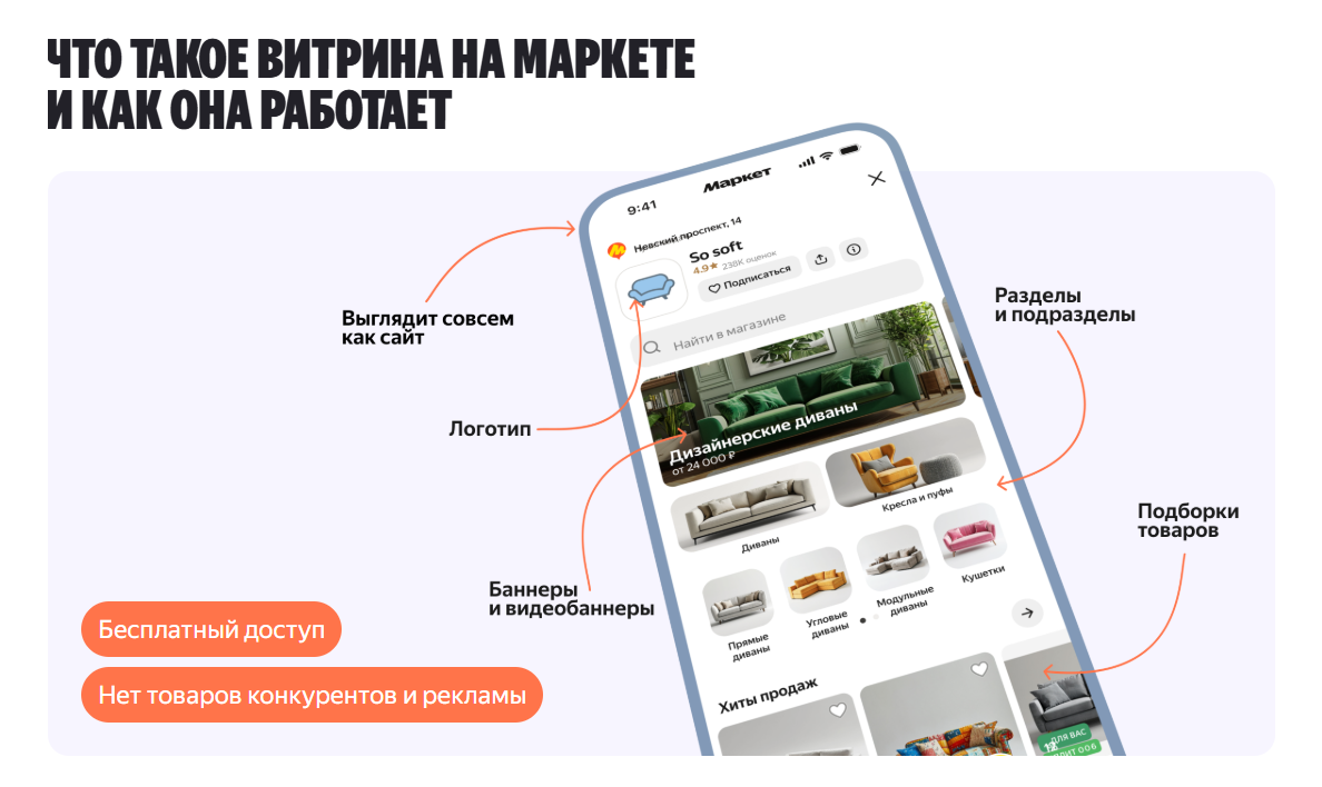 - «Витрина магазина» — ваша персональная страница-профиль на Маркете. Покупатели могут подписаться на нее. С конца 2024 года для продаж через собственную витрину действует льготная комиссия всего в 5%, зафиксированная до 2027 года.