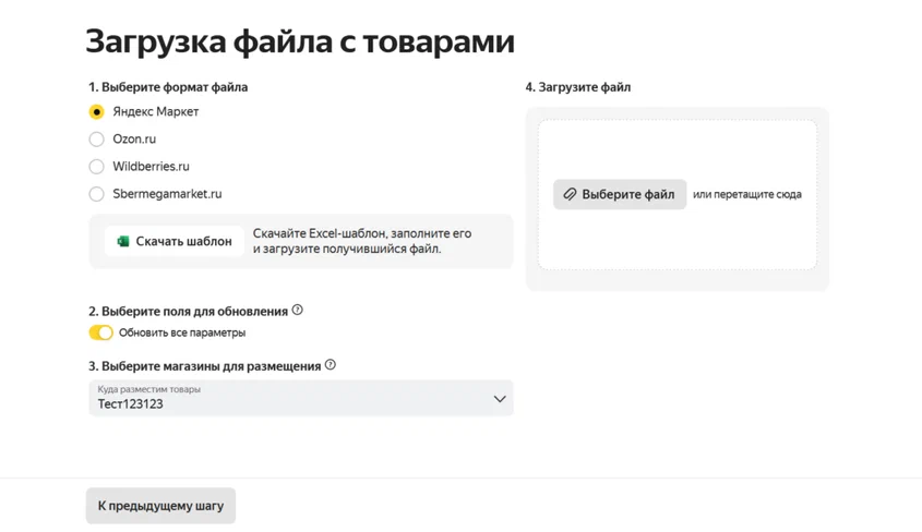 - Массово (через Excel-файл). Оптимально для 10+ товаров или для переноса ассортимента с другого маркетплейса. Скачайте шаблон, заполните его и загрузите.