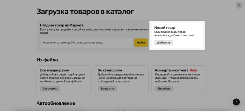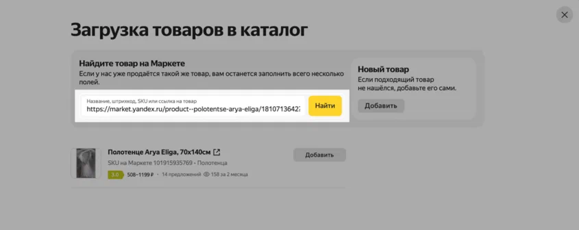 Если аналогичный товар отсутствует в базе данных Маркета, добавьте его сами с помощью опции «Новый товар».