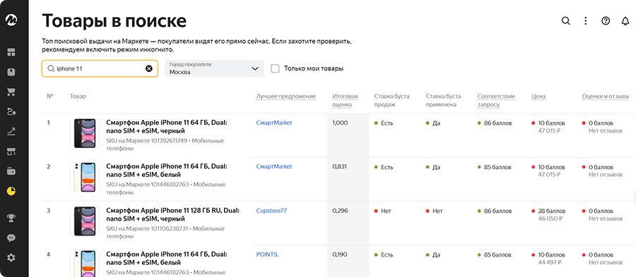 - Отчет «Товары в поиске» помогает понять, какие товары оказываются на верхних позициях внутреннего поиска по запросам и почему. Изучая лидеров выдачи, вы можете понять, какие факторы (цена, заполненность карточки, оценка, скорость доставки) больше всего влияют на ранжирование в вашей нише.