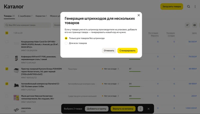 - Штрихкод (при отсутствии можно сгенерировать в своем ЛК). Убедитесь, что он совпадает с кодом в каталоге для идентификации товара на складе.