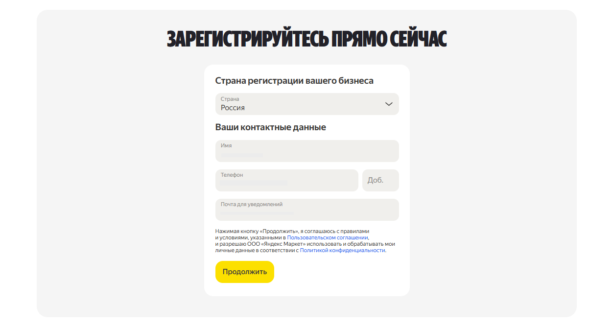 - Начало регистрации. Перейдите на сайт Яндекс Маркета и активируйте опцию «Стать продавцом». Вас попросят указать страну регистрации бизнеса, имя, телефон и электронную почту.
