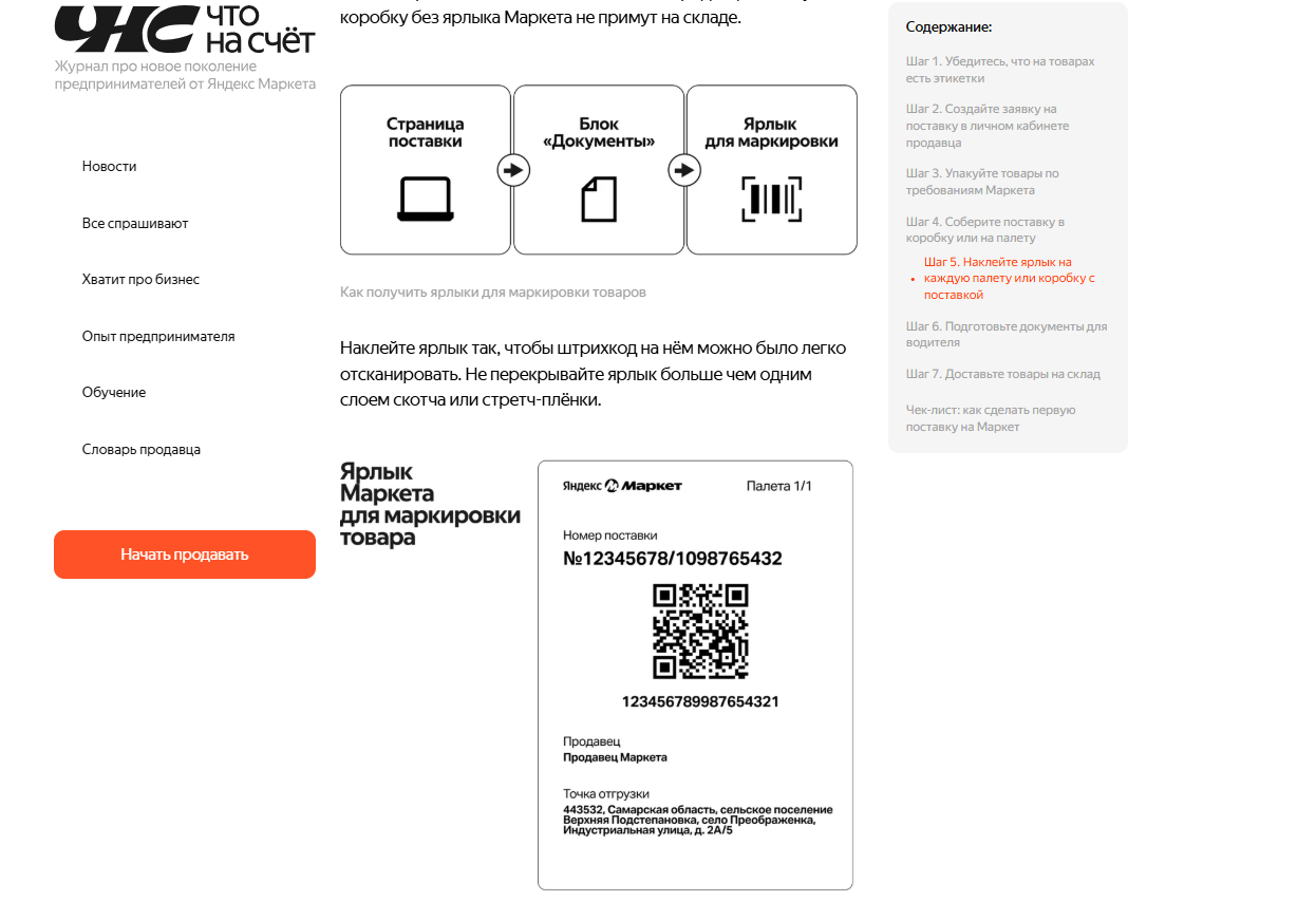 Из раздела «Логистика» в вашем личном кабинете необходимо скачать специальный ярлык от Маркета. Его следует разместить на каждой коробке или палете, участвующей в поставке. Важно понимать, что ярлык выполняет функцию транспортного идентификатора и позволяет системе склада корректно обработать вашу партию товаров. При этом он не является товарной этикеткой.