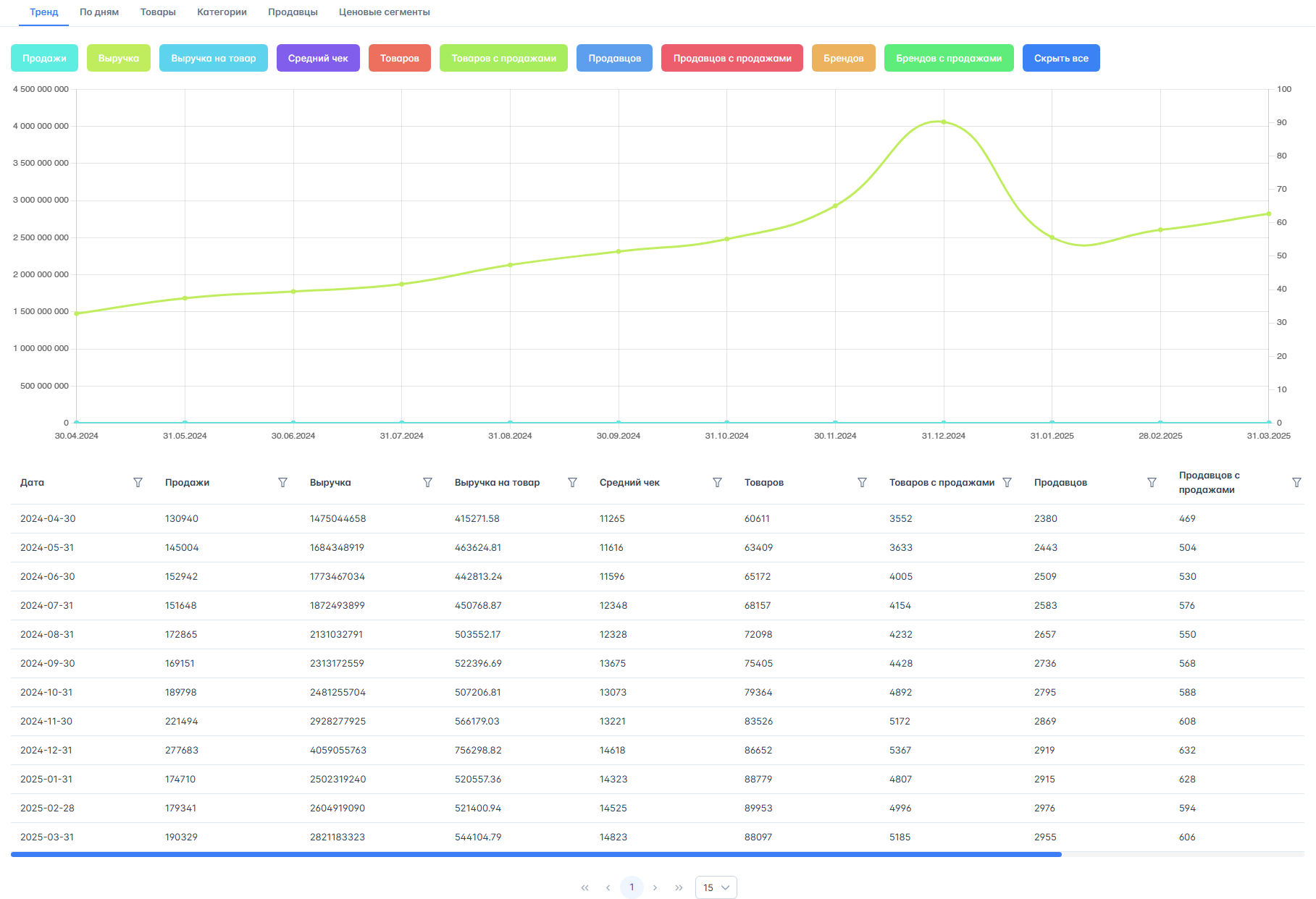 - Количество «Продавцов с продажами» и «Брендов с продажами» покажет, насколько рынок «распилен» между продавцами и марками.