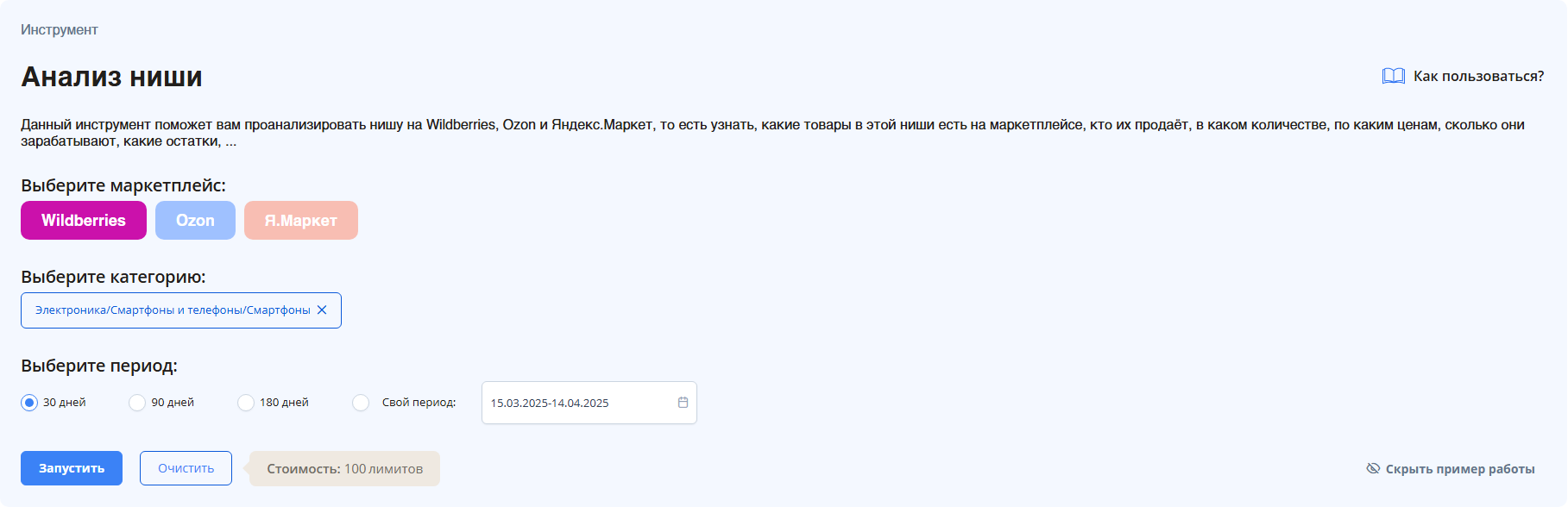 Вам нужно проанализировать 1 нишу, это будет стоить 100 × 1 = 100 лимитов.