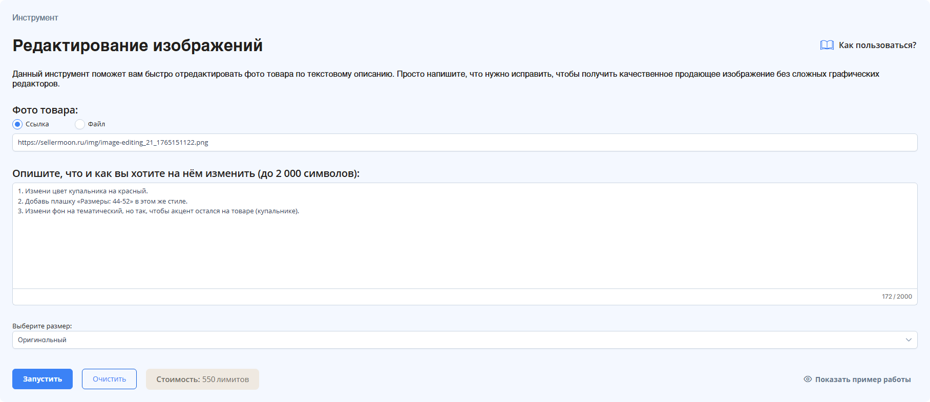 С помощью инструмента «Редактирование изображений» вы можете быстро и без специальных навыков работы с графическими редакторами отредактировать фото товара на Wildberries, Ozon или Яндекс.Маркет. Это поможет сделать его более актуальным, информативным и привлекательным.