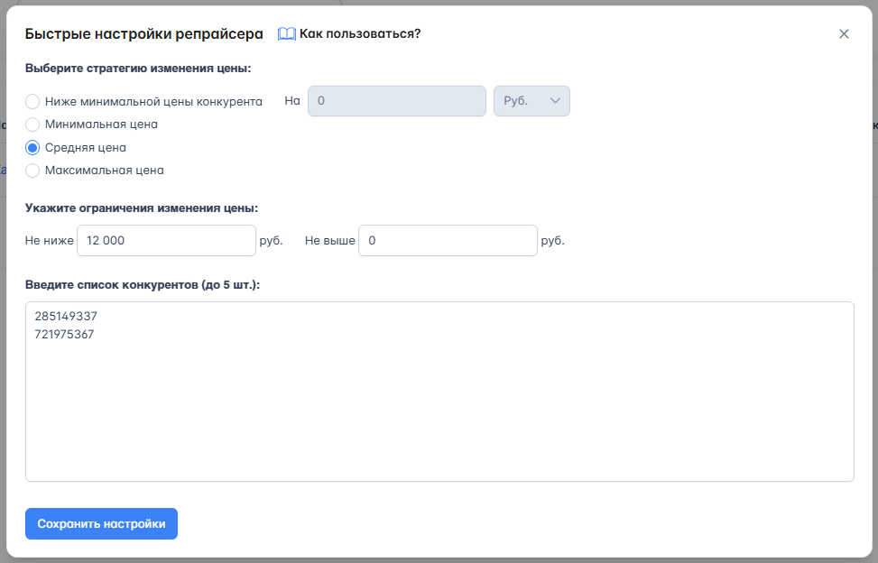 - Во всплывающем окне укажите: стратегию изменения цены, минимальную и максимальную цену, а также список товаров конкурентов, на цены которых следует ориентироваться.