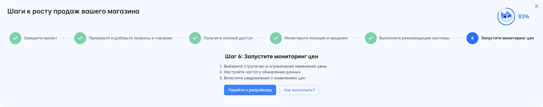 Шаг автоматически будет считаться выполненным, когда вы настроите и включите репрайсер хотя бы для одного товара.