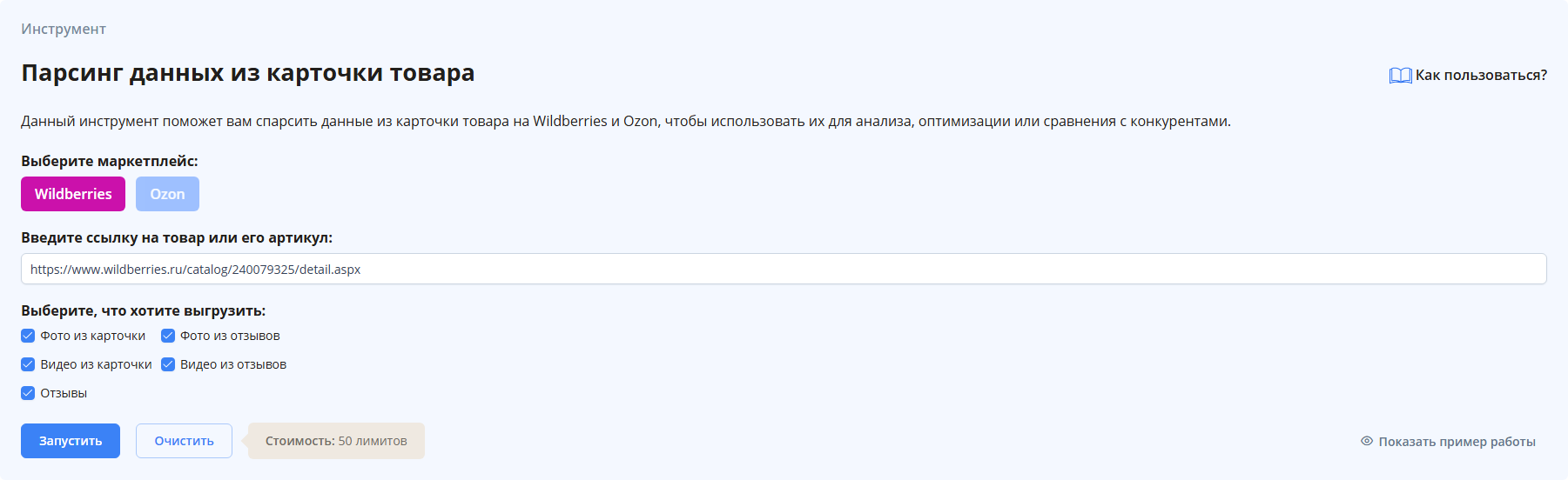 С помощью инструмента «Парсинг данных из карточки товара» вы можете спарсить фото, видео и отзывы из любой карточки товара на Wildberries или Ozon, чтобы проанализировать свои материалы, сравнить их с конкурентами и найти точки роста.
